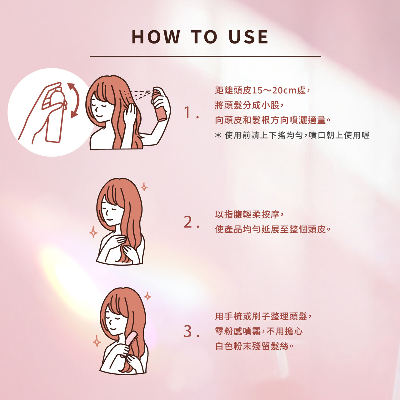 使用方法:距離頭皮15~20公分處,將頭髮分成小股,向頭皮和髮根方向噴灑適量,噴灑後按摩整個頭皮並用手指推勻,接著用手或梳子整理頭髮。